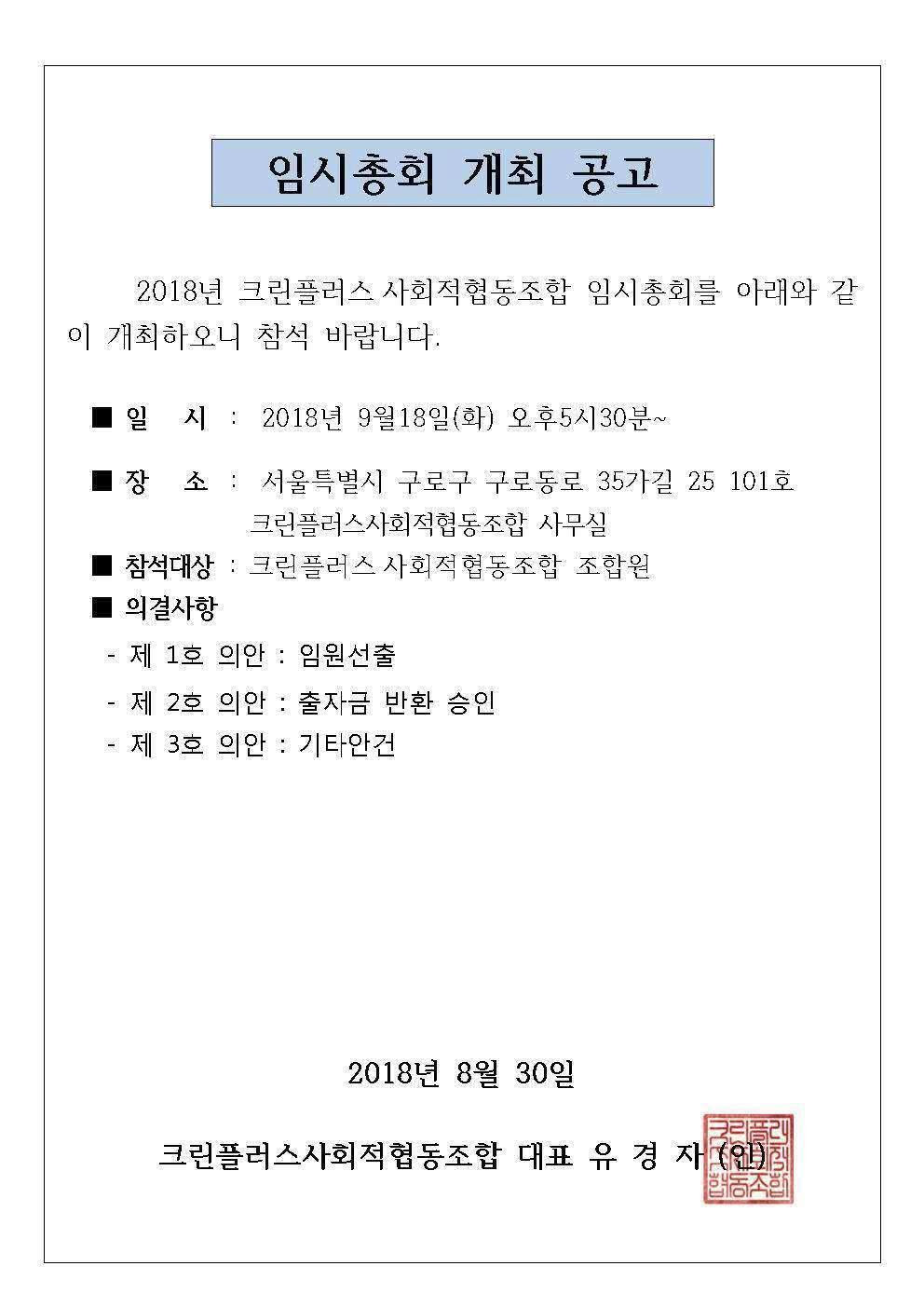 2018년 크린플러스사회적협동조합 임시총회 개최 공고