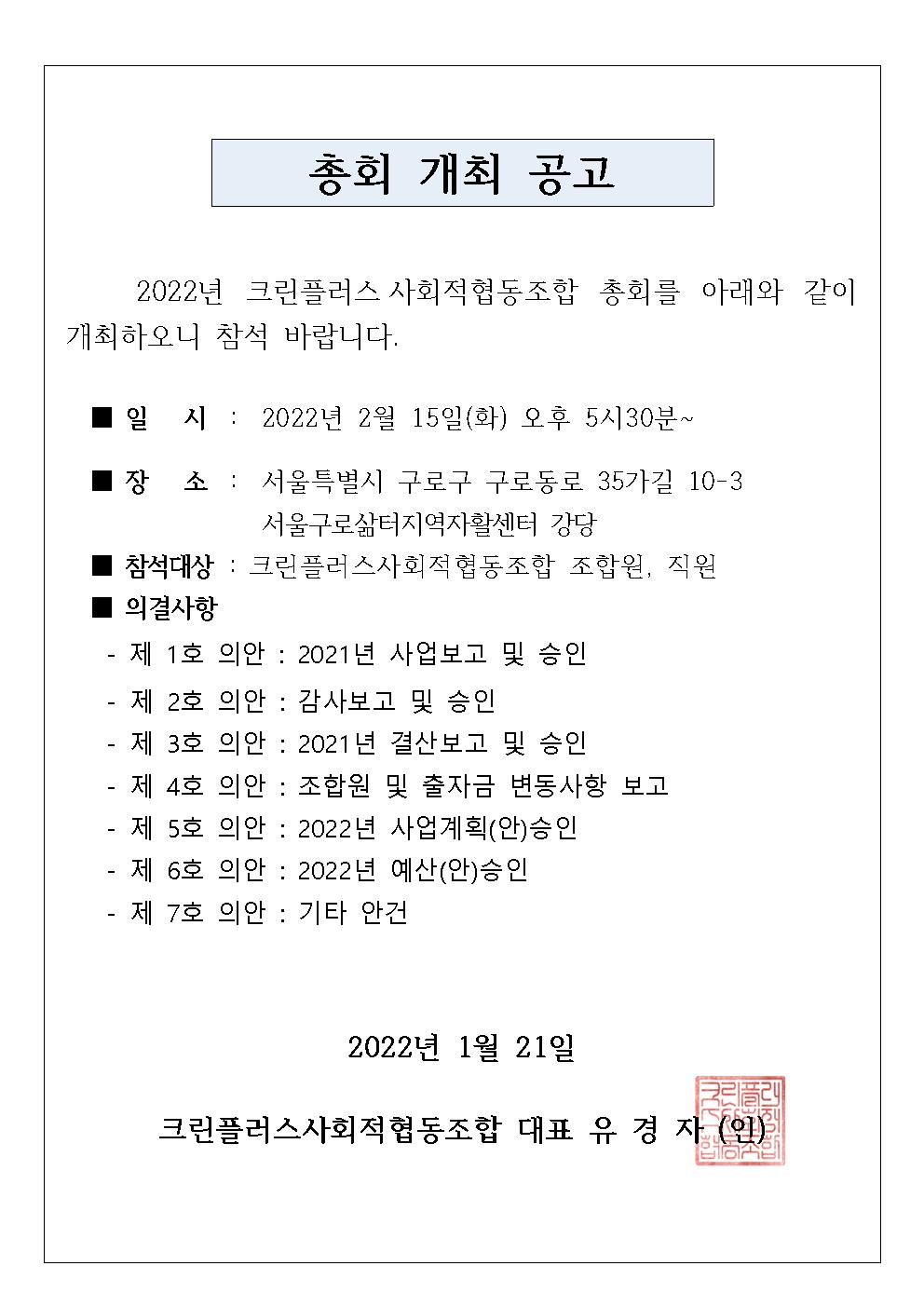 크린플러스사회적협동조합의 정기총회를 알려드립니다