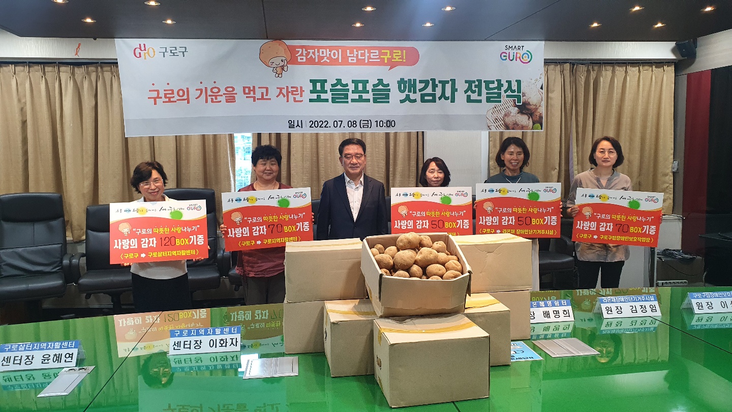 우리센터는 7월 8일 구로구 사회복지시설 4곳과 함께 감자전달식을 갖고 후원 받은 햇감자 120박스를 주민들과 나누었습니다.
